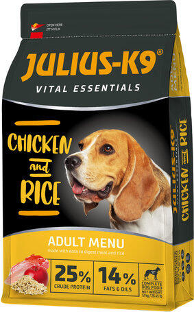 24kg A Julius-K9 Vital Essentials Adult Chicken & Rice egy csirkehúsos és rizses kutyatáp. Megbízható minőségű, jól hasznosuló prémium kutyaeledel a magyar tulajdonú világhíres márkától. Természetes összetevőkből készül, gyümölcs és zöldség forrású rosttartalommal, hozzáadott ízületvédővel és természetes forrású Omega-3 zsírsavakkal.