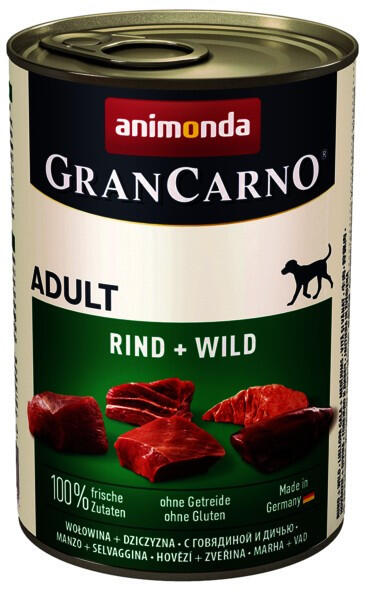 Animonda GranCarno Adult konzerv, marha és vad teljesértékű eledel felnőtt kutyáknak. A GranCarno kutyaeledel kizárólag friss húsfélékből készül, mint a szív, tüdő, színhús és máj. Minden termék a legkorszerűbb tudományos ismereteket felhasználva készült, figyelembe véve a különböző kutyafajtákat és igényeket, megfelelően táplálvaa kutyákat: természetesen, t