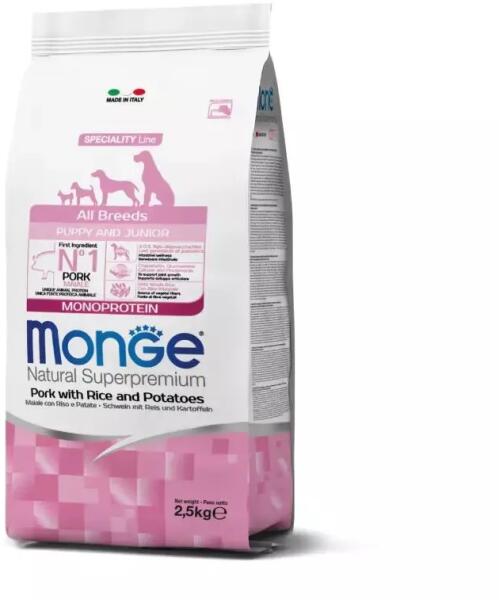 Monge Dog Speciality Line Monoprotein Puppy - Pork, Rice, PotatoTeljes értékű szárazeledel kölyök kutyák számára. Kutyája egészsége garantált a kiváló minőségű alapanyagoknak és az olasz szakértői kutatásnak köszönhetően. Fő összetevője a sertéshús, ami könnyen emészthető és a hozzáadott friss húsnak köszönhetően nagyon ízletes. A termék xylo-oligoszacharid