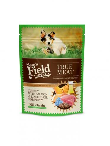 A Sam's Field True Meat Turkye with Salmon & Linseed Oil for Puppy egy teljes értékű állateledel kölyökkutyák számára (1 hónapos kortól 1 éves korig) pulykahússal, lazaccal és lenmagolajjal. Jellemzők :- Gabonamentes Összetétel :52% pulykahús és belsőszervek, 10% lazac, 4% tök, 1% borsóliszt, 1% lignocellulóz, 1% lenmagolaj. Analitikai összetevők Nyersfehérje 9,5 %, N