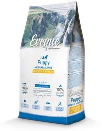 24kg Visán Evoque Dog Puppy Medium/Large Chicken & Turkey with Fruits & Vegetables (29/16) teljes értékű eledel csirke- és pulykahússal közepes (2-12 hónapos kor között) és nagytestű (2-18 hónapos kor között) kölyök kutyák számára.