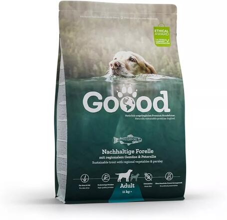 1.8kg Goood Adult Sustainable Trout gabonamentes szárazeledel felnőtt közepes- és nagytestű kutyák számára. Fenntartható gazdálkodásból származó pisztránggal, amely kiváló fehérje és omega-3, omega-6 zsírsav forrás. Kiváló minőségű összetevőkkel, így kiválló választás ételintoleranciával küzdő állatok számára. Hozzáadott cukor és mesterséges színezék, a
