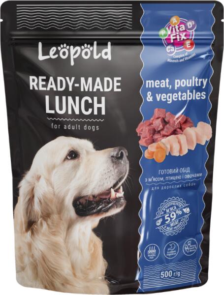 KÉSZ EBÉD HÚSSAL, BAROMFIVAL ÉS ZÖLDSÉGGEL FELNŐTT KUTYÁKNAK. Összetétel: marhahús, baromfi, belsőségek (59% hús és húskészítmények), zöldségek, gabonafélék, nyomelemek, vitaminok és ásványi anyagok. Szavatossági idő és tárolási feltételek: A gyártástól számított 24 hónap, 0° C és + 35° C közötti tárolási hőmérsékleten, legfeljebb 75%-os relatív pá