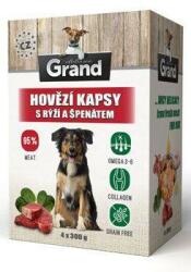 GRAND kapszulák. deluxe kutyahús rizzsel és spenóttal. 4x300g, A GRAND DELUXE BEEF RIZSSEL ÉS SPENÁTFAL teljes értékű nedves eledel minden felnőtt kutya számára. Friss húsból készül, és a kíméletes párolási eljárás biztosítja, hogy a hús ízletessége, állaga és tápértéke megmaradjon. A lenmagolaj Omega 3 és 6 telítetlen zsírsavakat tartalmaz, amelyek jótékonyan