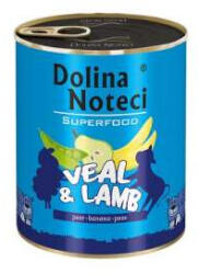 Dolina Noteci Superfood kutyakonzerv Borjú- és bárányhús (körte, banán, borsó) - 80%-a hús és állati származékok, egyedi tulajdonságokkal rendelkező húsfajták: pl. őz, szarvas, kenguru, kacsa stb. - kiváló minőségű fehérje, 90-95%-os emészthetőségi szinttel - a készterméket a mikrobiológiai biztonságának és tartósságának biztosításához szükséges minimális