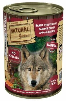 Natural Greatness Nyúl, vadhús, sárgarépa, olajbogyó, amarant konzerv kutyáknak 400 g, minőségi eledel minden fajta felnőtt kutyának ultra-prémium minőségű táp gyengéd nyúl- és szarvashússal, sárgarépával, olajbogyóval és amaránttal kiegészítveA tápanyag maximális hasznosulása és ízletessége érdekében az eledelt dúsítottuk:Sárgarépa - béta-karotinban és A-,