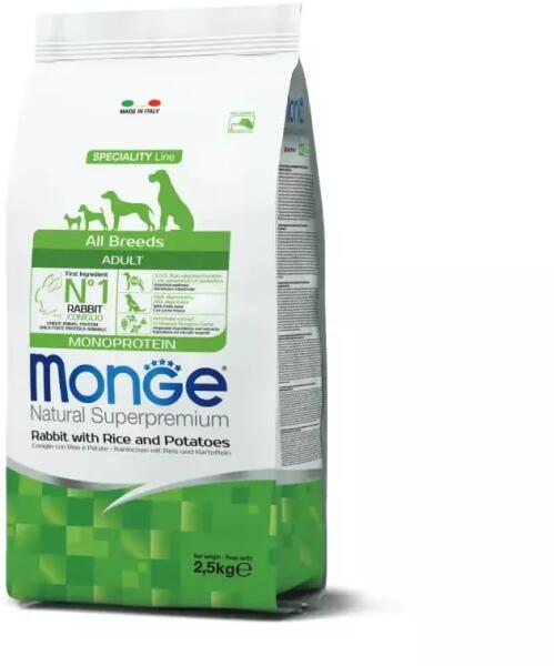 Monge Dog Speciality Line Monoprotein Adult - Rabbit, Rice, PotatoTeljes értékű szárazeledel felnőtt kutyák számára. Kutyája egészsége garantált a kiváló minőségű alapanyagoknak és az olasz szakértői kutatásnak köszönhetően. Kizárólag egyféle állati eredetű fehérjét tartalmaz. Fő összetevője a nyúlhús, ami könnyen emészthető és a hozzáadott friss húsnak k