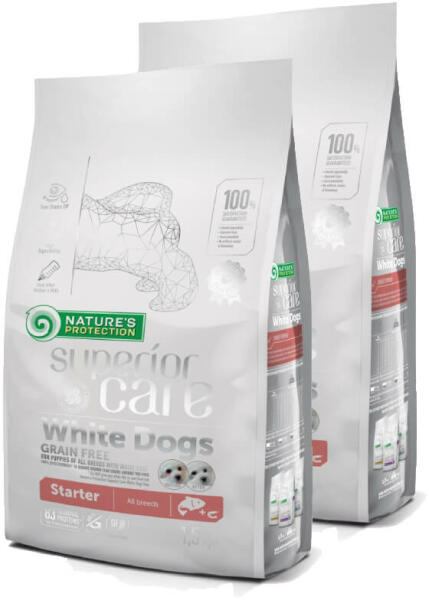 Teljes értékű gabonamentes eledel minden testméretű, fehér szőrű kölyök kutya részére. 4 hónapos korig Alkalmas vemhes és szoptató szuka kutyák etetésére. Összetétel: lazac 45% (szárított és finoman őrölt), szárított burgonyapép, édesburgonya, szárnyaszsír, borsó, krill liszt (min. 4%), cukorrépapép, lazacolaj, dinamikusan mikronizált klinoptilolit (1%), lenmag,