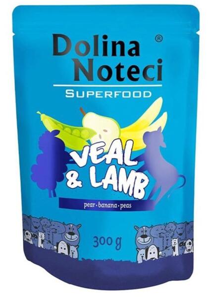 A Dolina Noteci Superfood nedves kutyaeledel 80%-ban tartalmaz húst és állati eredetű termékeket (45% borjúhús, 35% bárányhús). A receptúra friss gyümölcsöket és természetes adalékanyagokat is tartalmaz, amelyek rendkívül magas - a kutya szervezetére pozitívan ható - biológiailag aktív összetevőkkel rendelkeznek, mint például az új-zélandi kagyló vagy a tengeri mosza