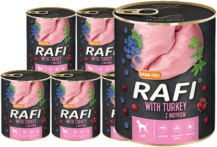 Dolina Noteci Rafi pulykával 800g - Leírás Teljes értékű nedves eledel minden fajta felnőtt kutyának - pulykával. A pulykahús és a nyersanyagok - amellett, hogy lizinben és metioninban gazdag, teljes értékű fehérjét tartalmaznak - értékes, többszörösen telítetlen zsírsavak forrása, különösen az n-6 zsírsavak családjából, amelyek jótékony hatással vannak a bőrre