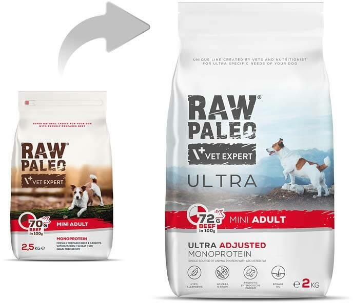 Raw Paleo Ultra Mini Adult Adult Beef teljes értékű eledel felnőtt (8 hónaposnál idősebb), kistestű (8 kg testsúly alatti) kutyák számára. Hipoallergén és monoprotein eledel, ami azt jelenti, hogy csak egy állati fehérjeforrást (marhahús) tartalmaz, és egy hozzáillő zsírforrással (marhahús zsír) rendelkezik. Formulája borsó- és gabonamentes, és bóraolajat is tartalmaz