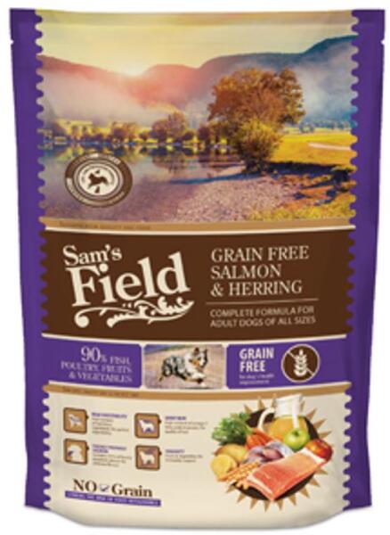 A Sam's Field Adult Grain Free Salmon & Herring egy teljesértékű állateledel felnőtt kutyák számára . Jellemzők:- gabonamentes - 90% hal, baromfi, gyümölcs, zöldségÖsszetétel:Laza c 26% (16% lazacliszt, 10% friss egész lazac), hering 26%, burgonya 20%, sárgaborsó 8%, baromfi zsír (kevert tokoferolokkal tartósítva, E-vitamin forrás) 8%, szárított alma 4%, lazacolaj 3%, c