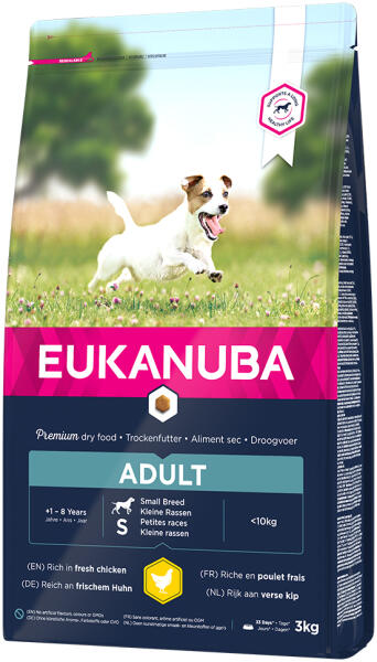 A zooplus. hu kínálatából: Gyakran a kis testű ebek a legnagyobb kalandorok és egész nap mozgásban vannak. Ahhoz, hogy kellő energiával rendelkezzenek a"napi adag akcióhoz", tápanyagdús, kiegyensúlyozott eledelre van szükségük, amelyet az igényeikhez igazítottak. Az Eukanuba Adult Small Breed csirke tápot speciálisan kis testű (max. 10 kg) fajták szükségleteinek megfelelő