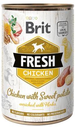 BRIT FRESH CHICKEN WITH SWEET POTATO – Csirke édesburgonyával A Brit Fresh ízekben gazdag, komplett és kiegyensúlyozott tápanyagot biztosít, helyi forrásokból származó hússal, belsőségekkel, zöldséggel, gyümölccsel és gyógyfüvekkel. Friss húsból készült, így az magában megőrzi annak természetes konzisztenciáját és aromáját, mindezzel egyedi ízt adva a termékne