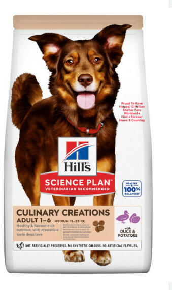 A Hill's Science Plan CULINARY CREATIONS ELEDEL KÖZEPES TESTŰ FELNŐTT KUTYÁK SZÁMÁRA KACSÁVAL és BURGONYÁVAL egy teljes értékű eledel az 1-6 éves, közepes testű, felnőtt kutyák számára. Kifejezetten válogatós állatok számára kifejlesztett eledel, melyet speciális ízesítésével a kutyák döntő hányada elfogad akkor is, ha korábban más típusú eledellel etették. KA