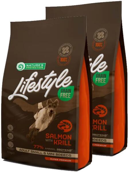 Natures Protection Lifestyle Dog Adult Grain Free Salmon with krill Small&mini 1,5kg Teljes értékű gabonamentes eledel mini és kistestű felnőtt kutyák részére. (Felnőttkori testtömeg 1-10kg. ) A Natures Protection Lifestyle Dog Adult Grain Free Salmon with krill Small&mini 1,5kg összetétele lazac 44% (szárított és finoman őrölt), burgonya pehely, borsó, szárnyaszsír,