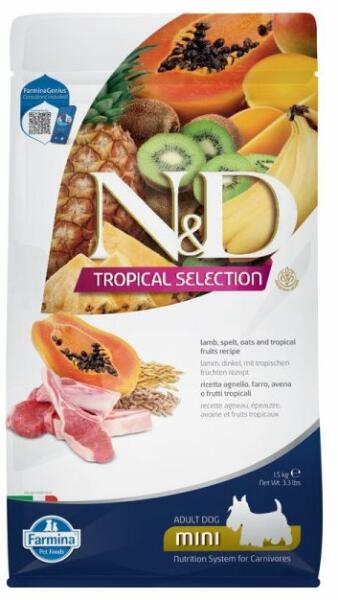 Bárány, tönkölybúza, zab, trópusi gyümölcsök receptúra. Teljes értékű eledel felnőtt kutyák részére. Összetevők: bárány (20%), dehidratált bárányfehérje (20%), tönkölybúza (12%), zab (12%), csirkezsír, dehidratált heringfehérje, szárított répaszelet, halolaj (heringből), szárított sárgarépa, lucernaliszt, inulin, frukto-oligoszacharidok, élesztő kivonat (ma