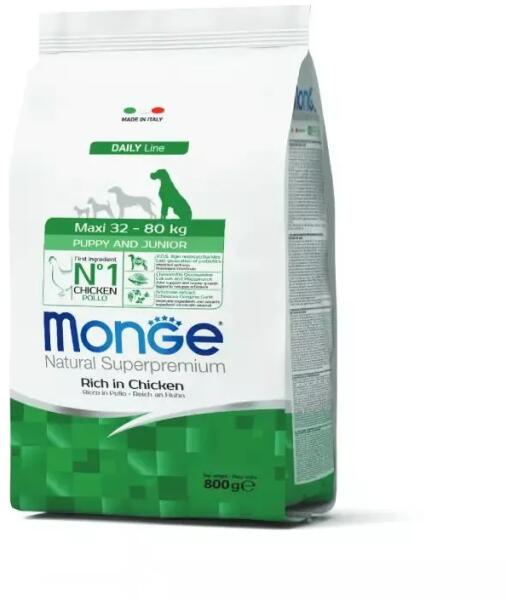 Monge Dog Daily Line Maxi Puppy, JuniorTeljes értékű szárazeledel nagytestű (32-80 kg) kölyök kutyák számára csirkével. A kiváló minőségű alapanyagoknak és az olasz kutatómunkának köszönhetően egészséges táplálkozást biztosít kutyájának. A termék fő összetevője a csirke, amely könnyen emészthető és a friss hús hozzáadásának köszönhetően nagyon ízletes.