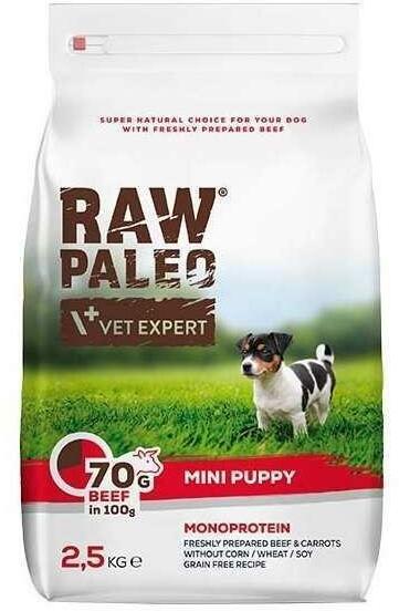 RAW PALEO KISTESTŰ KÖLYÖKKUTYA - MARHAA Raw Paleo Puppy Mini Beef egy teljes értékű és tökéletesen kiegyensúlyozott eledel kistestű kölyökkutyák számára (felnőtt testtömegük nem haladja meg a 8 kg-ot), elválasztástól 12 hónapos korig. Az eledel gabonamentes és monoprotein, ami azt jelenti, hogy az egyetlen fehérjeforrás a marhahús. A tengeri hínárolaj-kivonatok hozzáa