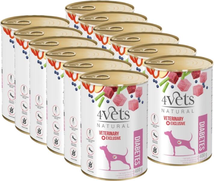 A 4vets Diabetes Veterinary Diet egy teljes értékű diétás kutyatáp, amely a cukorbetegséggel diagnosztizált háziállatok és a sterilizációs műtétet követő túlsúlyos, elhízott kutyák igényeihez igazodik. Az étrendben található rostok és a gyorsan felszabaduló szénhidrátok alacsony szintje segít a kutya vércukorszintjének és testsúlyának szabályozásában. A cukorb