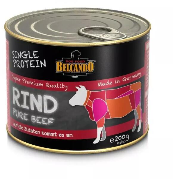 Szín marhahús 200g Magas értékű, fajtánként válogatott színhús konzervHat féle válogatott húsfajtában kapható, további adalékok nélkül. BELCANDO® Mix it GF-vel elkeverve kiválóan alkalmas a kizárásos diétára vagy táplálék-összeférhetetlenség esetén hosszútávú etetésre. SINGLE PROTEIN (egy fajta fehérjés) konzervek Magas értékű, fajtánként válogatott sz