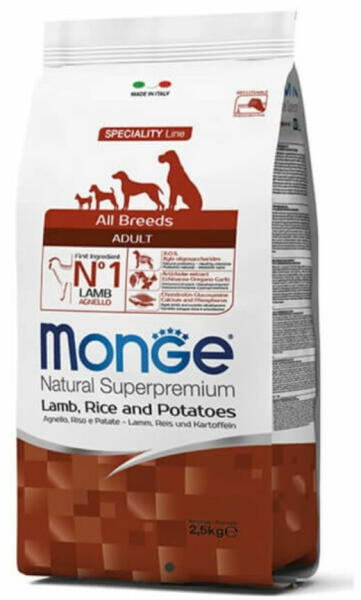 A Monge Dog Speciality line All Breeds Adult Bárány, Rizs , Burgonya egy teljes értékű, bárányos száraztáp felnőtt kutyák számára. Minden méretű és fajtájú felnőtt kutya számára ideális. Ínycsiklandó bárányhúsos-rizses-burgonyás ízkombináció. - A bárányhús különösen jó minőségű fehérjékben gazdag hús, ami szinte az összes lényeges aminosavat tartalmazz
