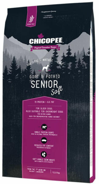 Chicopee HNL Soft Senior Goat-Potato Kutyatáp 2kg Teljes értékű, gabonamentes kutyatáp idősödő kutyáknak kecskével és burgonyával A Chicopee HNL Soft Senior Goat-Potato kutyatáp gabonamentes , kecskehúsos receptúrával készült, amely kifejezetten az idősödő kutyák számára lett kifejlesztve, különösen a 7 éves kor feletti kutyák etetésére. Az alacsony zsírtartalom és