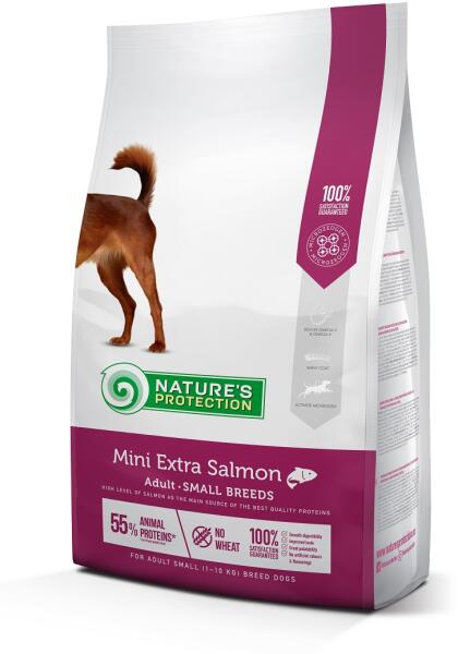 Natures Protection Dog Extra Salmon Mini – 2kg Lazacban gazdag teljes értékű eledel kistestű felnőtt kutyák számára A Natures Protection Dog Extra Salmon Mini egy prémium minőségű, lazacban gazdag kutyaeledel, amely kistestű felnőtt kutyák számára készült. Az extra lazac tartalom (min. 14%) biztosítja a kutyája számára szükséges fehérjét és omega-3 zsírsavakat , mik