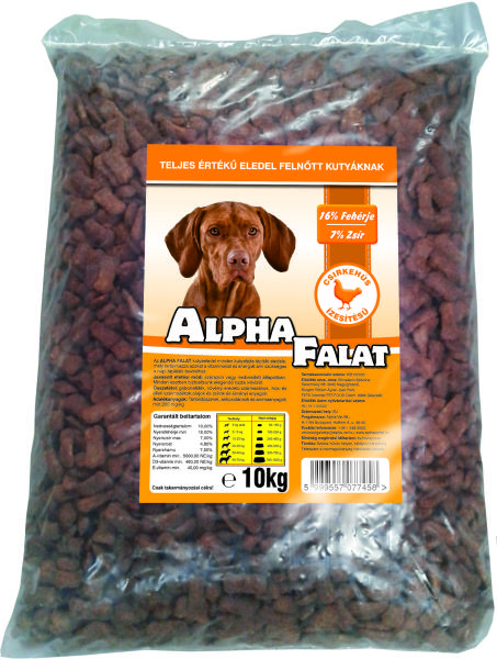 ALPHA FALAT CSIRKÉS 10KG Teljes értékű száraz kutyaeledel normál aktivitású felnőtt kutyák részére csirke ízesítéssel. Az Alpha Falat etetésével a garantált minőségű nyersanyagok alkalmazásának köszönhetően kutyája egy kiválóan emészthető kellemes ízű szívesen fogyasztott táplálékhoz jut. Szárazanyag min. 93% nyersfehérje min. 16% nyerszsír min. 6% nyersrost