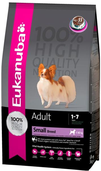 Eukanuba Adult Small Kutyatáp 3kg – Kistestű felnőtt kutyáknak Az Eukanuba Adult Small kutyatáp 3kg kiszerelésben kifejezetten kistestű felnőtt kutyák számára készült, akiknek magas fehérje- és energiaigényük van. A tápban található friss csirkehús és szárított csirke és pulyka magas minőségű fehérjeforrásként szolgálnak, segítve a kutyája izmainak karbantartás