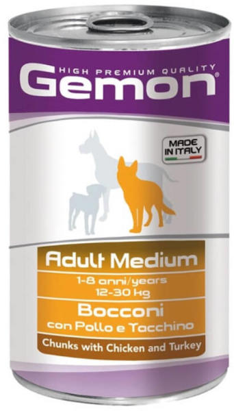 A Gemon Dog Adult Medium konzerv csirke-pulyka egy teljes értékű csirkés nedveseledel felnőtt kutyák számára. Kifejezetten közepes testméretű felnőtt kutyáknak kifejlesztett nedveseledel. A Gemon Konzervek úgy lett kialakítva, hogy minden tápanyagot biztosítson négylábú barátaink mindennapi vitalitásához. Ínycsiklandó csirkés- pulykás nedveseledel. A csirkehús jól hasz