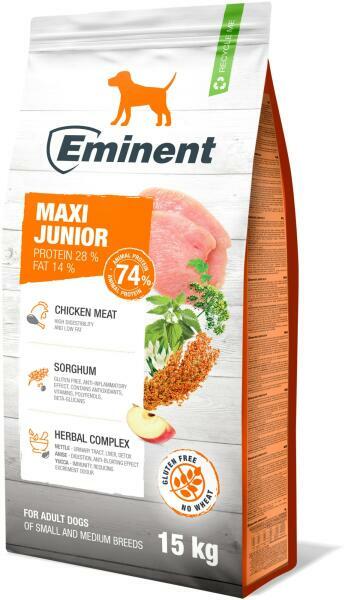 Eminent Maxi Junior 28/14 Teljes értékű kutyatáp nagy- és óriás testű fiatal kutyáknak, vemhes és szoptató szukáknak Komplett tápanyagot és energiát biztosít a nagy- és óriás testű kutyák növendékeinek, támogatja a helyes növekedését, az izmok és csontok megfelelő fejlődését. A kondroitin, glükózamin, illetve az ideális kalcium és foszfor aránya biztosítja a f