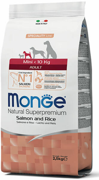 A Kibbles Monge Natural Superpremium speciális sor, a lazac és a rizs teljes méretű táplálékot kínál kis méretű felnőtt kutyák számára. Garantálják kutyájának jólétét, kiváló minőségű tápanyagoknak köszönhetően, amelyek a Made in Italy kutatás eredményei. Nagyon ízléses termékek, az egyetlen fehérjegarancia mellett: csak egy fajta hús. A fő összetevő a laza