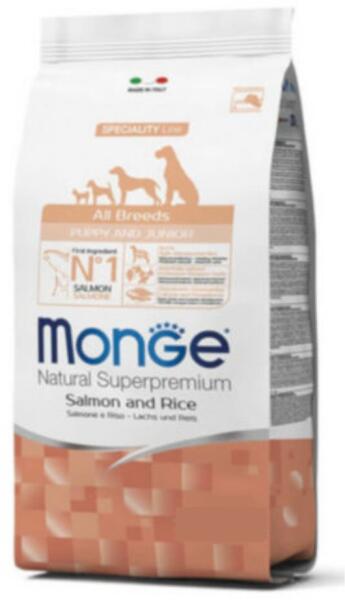 12kg Monge Speciality Line Dog Puppy & Junior Monoprotein Salmon with Rice teljes értékű kölyöktáp. Fő összetevője a lazac, ami könnyen emészthető és a hozzáadott friss halnak köszönhetően nagyon ízletes. Kizárólag egyféle állati eredetű fehérjét tartalmaz. A termék xylo-oligoszacharideket és probiotikumokat tartalmaz, amelyek támogatják a kölyökkutyák megfelel