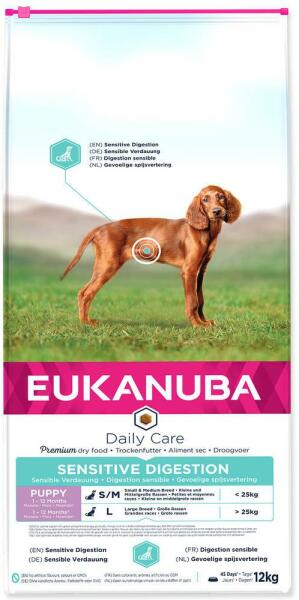 Eukanuba Daily Care Puppy Sensitive Digestion 12kg - TermékleírásAz EUKANUBA Daily Care friss csirkehússal érzékeny emésztőrendszerű kölyökkutyáknak kifejezetten az érzékeny gyomrú kutyák számára lett kifejlesztve. A könnyen emészthető rizs jelenlétének köszönhetően az eledel alternatívát kínál a különleges táplálkozási igényű kölyökkutyák számára. Az eled