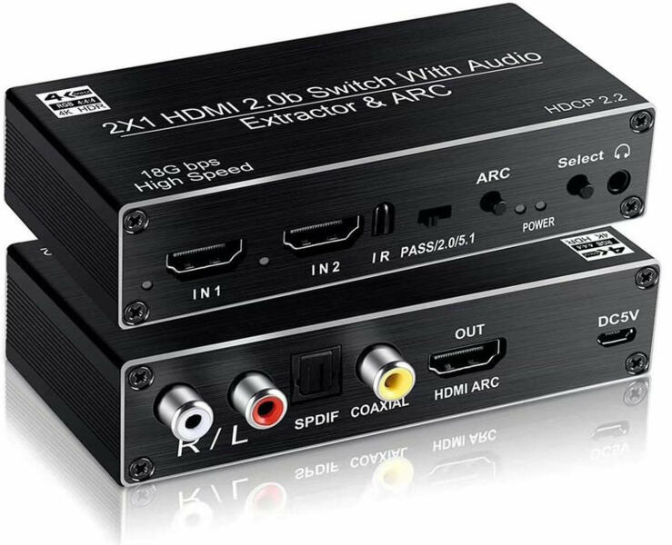 Műszaki adatok: - HDMI 2.0b - Bemenetek: 2×HDMI, 1×Headphone - 3.5mm Jack - Kimenetek: 1×HDMI, 1×Koaxiális, 1×SPDIF, 2×RCA(L/R) - HDCP 2.2 - 3D támogatás - Felbontás: 4K/2K@30hz - ARC funkció - Audio támogatás: LPCM 7.1CH, Dolby TrueHD, DTS-HD Master Audio - Beépített "Switch" gomb - Távirányító - Micro USB 5V tápellátás - Plug & Play Leírás: Ez a HDMI Switch lehetőv