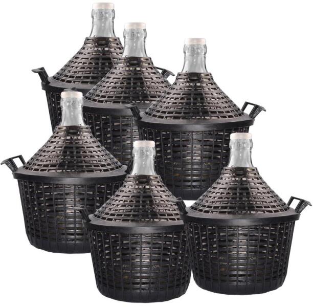 Demizson 6 db. -os szett Olasz gyártású üveg demizson, levehetõ műanyagkosaras borítással. Demizsonüveg fehér, áttetszõ, a ballonszáj vastag. A törés védelmet a leszedhetõ kétrészes műanyag kosár biztosítja. A kosár színe a képen látható sötét színű. Az üvegballonhoz szállításvédõ kupakot adunk. Üvegballon adatok Űrtartalom: 20 liter Magasság: 48 cm Üvegsz
