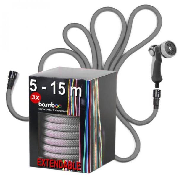 SZÜRKE locsolótömlõ szett BAMBBO ESTENSIBILE csavarodás és törésmentes szuper intelligens locsoló szett, 1/2 colos méretű tömlõ-csatlakozókkal, csap-csatlakozóval, és hatállású lepattintható locsolófejjel. A tömlõhöz a csatlakozók szabványméretűek. Levédett technológia, mely garantáltan szuper könnyű, csavarodás és törésmentes öntözõ szett. A profi intellige