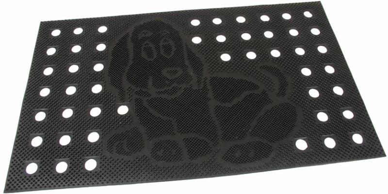 Részlet a kutyaszőnyegrőlKutyagumi tisztítószőnyeg 45 × 75 × 0,7 cm Egy praktikus gumiszőnyeg gondoskodikmegtisztítja cipőjét a finomabb szennyeződésektől, mint például a sár és a fű. Méreteinek köszönhetően alkalmas például lakás, ház vagy iroda bejárata elé. középen kutyamotívum, körülötte vízelvezető lyukak strapabíró és igénytelen anyag könnyű tiszt