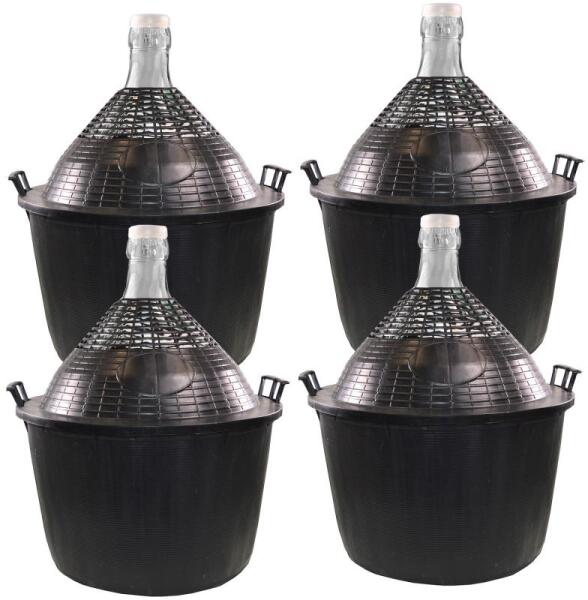 Demizson 4 db. -os szett Olasz gyártású üveg demizson, levehetõ műanyagkosaras borítással. Demizsonüveg fehér, áttetszõ, a ballonszáj vastag. A törés védelmet a leszedhetõ kétrészes műanyag kosár biztosítja. A kosár színe a képen látható sötét színű. Az üvegballonhoz szállításvédõ kupakot adunk. Üvegballon adatok Űrtartalom: 54 liter Magasság: 62 cm Üvegsz