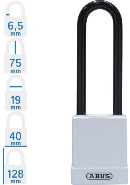 ABUS 76/40HB75 LOTO munkavédelmi kizáró lakat (méret: lásd a képen): speciális ötvözetű Abus lakat, műanyag bevonatú kengyellel, kétoldali golyós reteszeléssel. Az ABUS 76/40HB75 LOTO munkavédelmi kizáró lakat 10 különböző színben rendelhető! Minőségi ABUS zárbetét, 1 db kulcs/lakat. A lakat test mélysége: 22 mm. Szigetelt, különösen hőálló – forró és elektr