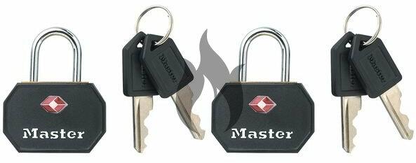 2 db Master Lock TSA 4681EURTBLK lakat készlet 30 mm szélességgel . A zár alumíniumból készült , és ABS védőburkolattal rendelkezik. A Master Lock 3. biztonsági osztályba tartozik. Biztosítsa ingatlanát egy 3 mm átmérőjű acél kengyellel , amely ellenáll a vágással és vágással szemben. Hengerbélést tartalmaz , 3 pohárral közös kulccsal. A csomag 4 db kulcsot tartalmaz