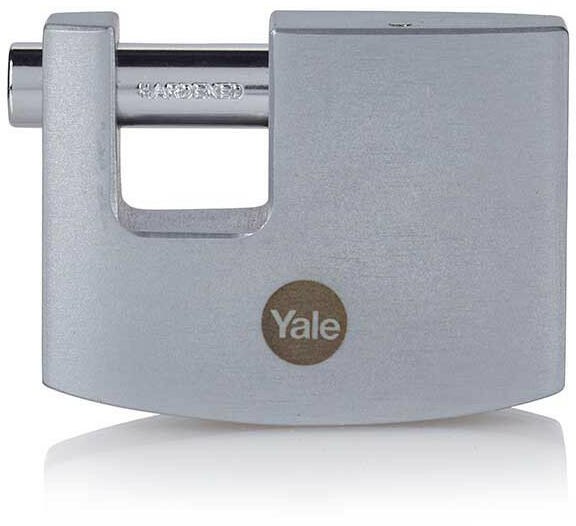 Yale-Y124B/60/110/1 krómozott tömb lakat masszív sárgaréz lakattest króm bevonattal edzett acél kengyel kettős reteszeléssel korrózióálló belső szerkezet nagy szakítószilárdság EN 12320 szerinti III biztonsági osztály maximális védelem kengyellevágás fúrás, maghúzás és finomnyitás ellen 96 óra korrózióállósági garancia szélsőséges időjárási viszonyok köz