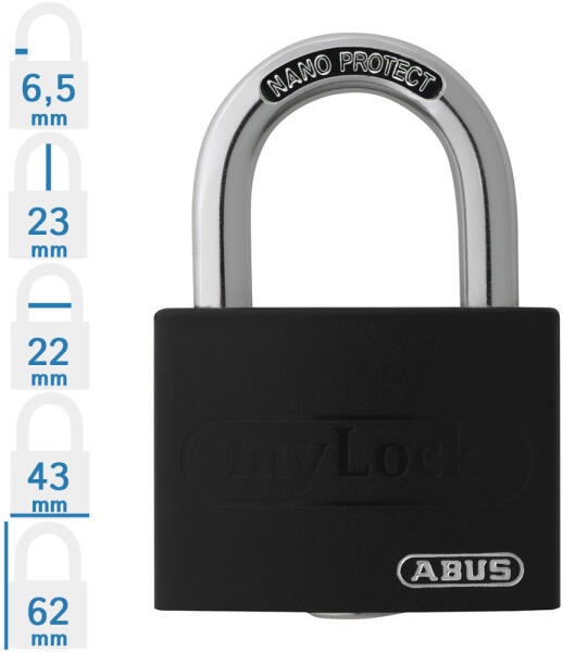 ABUS T65AL/40 lakat (méret, kivitel: lásd a képen): alumínium Abus lakat kétoldali golyós reteszeléssel. Acél kengyel, 18 mm-es lakat test mélység. Az ABUS T65AL/40 lakat használható munkavédelmi gyüjtőlakatokkal illetve munkavédelmi kizáró lakatként egyaránt. A lakat egyik oldala filctollal feliratozható. 6 különböző színben rendelhető! Minőségi ABUS zárbetét, 2 db