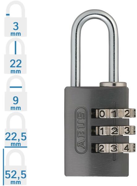 ABUS 724/20 (145/20) számzáras bőrönd lakat (poggyász lakat): Nyitás a megfelelő kód beállítását követően lehetséges. Acél kengyel, 13,5 mm-es lakat test mélység. Egyedileg beállítható 3 számjegyű számkombináció. Méret: lásd a képen. Abus biztonság: 3/10. ABUS számkombinációs lakat – kulcs nélküli zárás A kompakt számkombinációs lakatok sokoldalú felhaszn