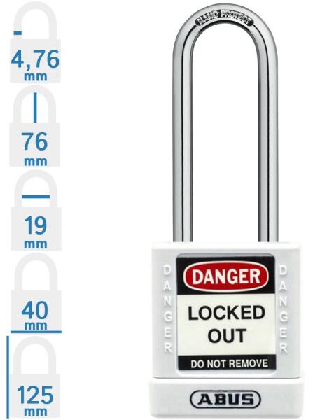 ABUS 74BS/40HB75 LOTO munkavédelmi kizáró lakat (méret, adatok: lásd a képen): alumínium lakat kétoldali golyós reteszeléssel. Acél kengyel, 20 mm-es lakat test mélység. Az ABUS 74BS/40HB75 LOTO munkavédelmi kizáró lakat 10 különböző színben rendelhető! Minőségi ABUS zárszerkezet, 1 db kulcs. Szigetelt, különösen hőálló – forró és elektromos környezetben is hasz