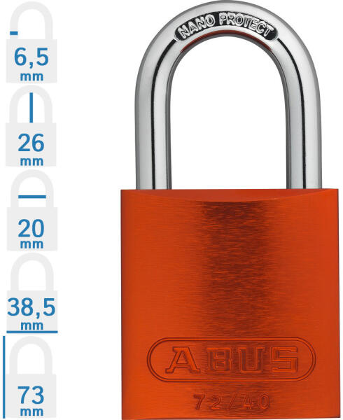ABUS 72/40 LOTO munkavédelmi kizáró lakat (méret, adatok: lásd a képen): speciális ötvözetű Abus lakat kétoldali golyós reteszeléssel. Acél kengyel, 19 mm-es lakat test mélység. Az ABUS 72/40 LOTO munkavédelmi kizáró lakat 7 különböző színben rendelhető! Minőségi ABUS zárbetét, 2 db kulcs. Azonos zárlatú, egykulcsos lakatok, mely tetszőleges számban rendelhetők az