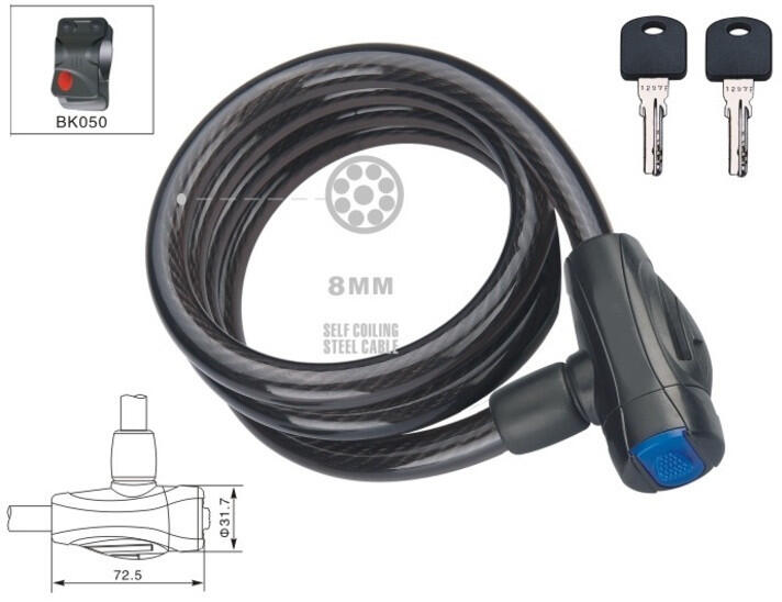 Spirál kerékpár lezáró Sodrott acél, műanyag bevonattal Méret:8x1800mm Zárás: biztonsági kulcsos Füstszínű Tartóval