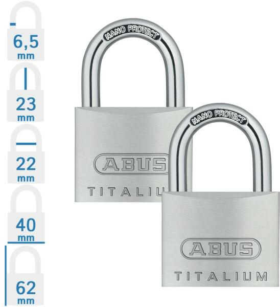 ABUS 727TI/40 Twins lakat szett (méret: lásd a képen): gyári egységcsomagolású azonos zárlatú, egykulcsos lakatok, 2 db / csomag. Speciális ötvözetű Abus Titalium lakat kétoldali golyós reteszeléssel. Minőségi ABUS zárszerkezet, kulcsok száma: 3 db, mely mindkét lakatot nyitja! TITALIUM lakat: Erős és könnyű - Az ABUS biztonsági szakértői által tervezett TITALIUM lakat