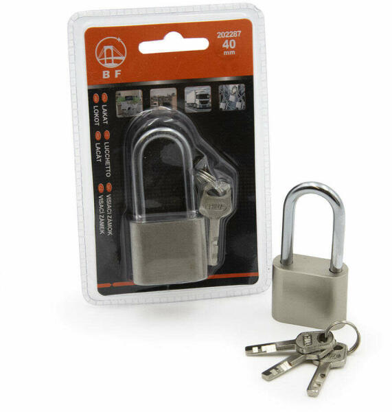 40 mm széles lakat Biztonságos használat A csomagban 3 darab kulcsot találsz40 mm hosszú kengyelű lakat, 3 db kulccsal Szeretnéd lelakatolni a ruhásszekrényedet, széfedet, vagy bármi mást? Akkor ez a 40 mm hosszú kengyelű lakat biztosan jól jön majd neked! Ez a lakat hasznos lehet olyan helyeken, ahol távolabbi pontokat kellene összekötni biztonságosan, például üzletek, rakt